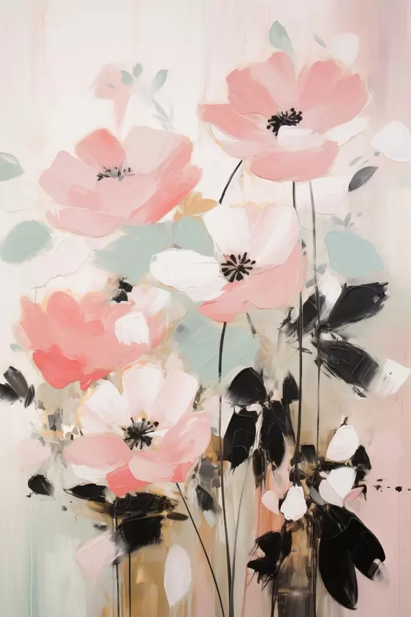 Poster Rosa und schwarze Blumen mit Blättern, sanfte Pastellfarben, abstraktes Blumenarrangement, minimalistische Kunst Nr f46688