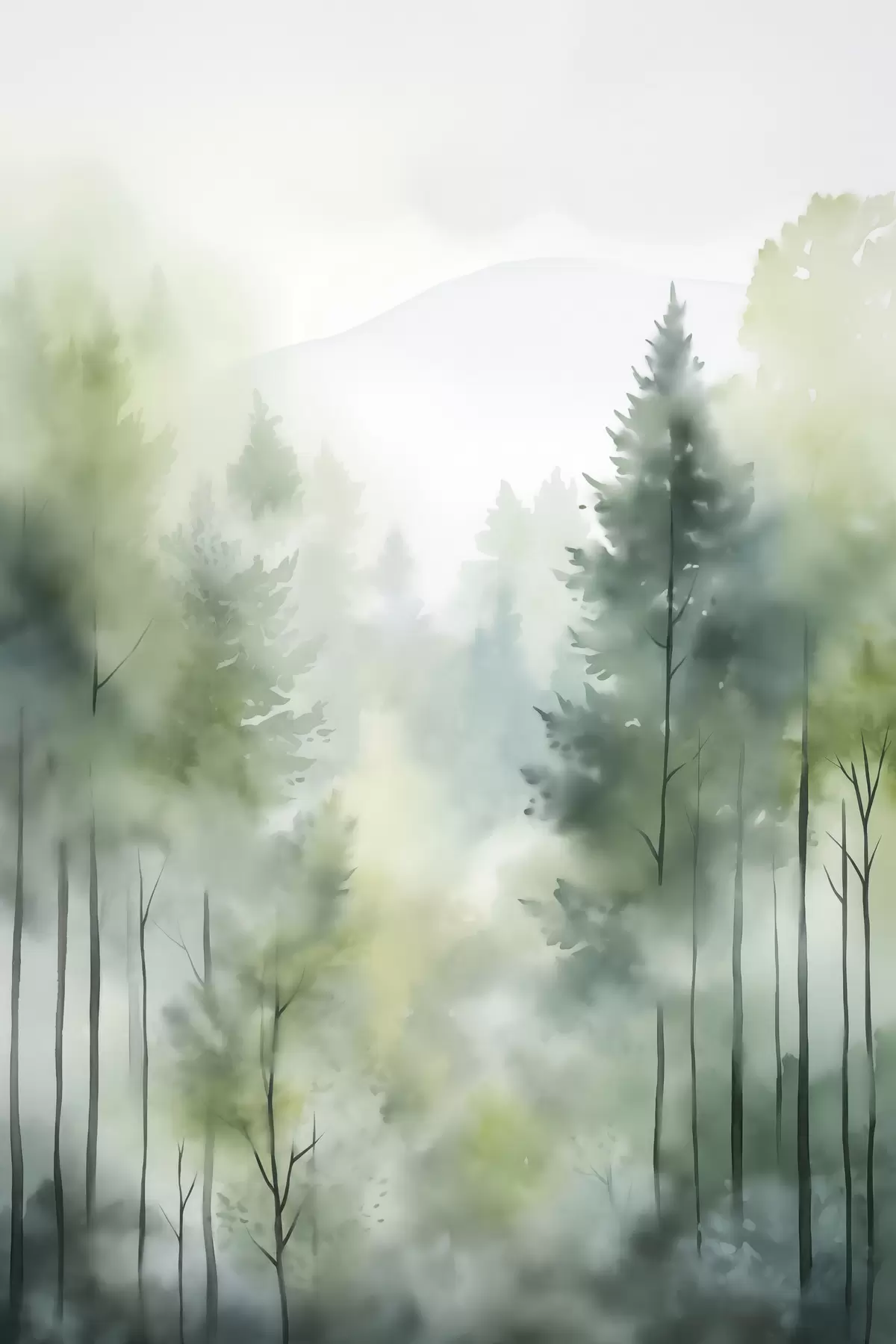 Poster Aquarellmalerei, die einen nebligen Wald mit hohen Kiefern und Bergen im Hintergrund darstellt Nr f46690
