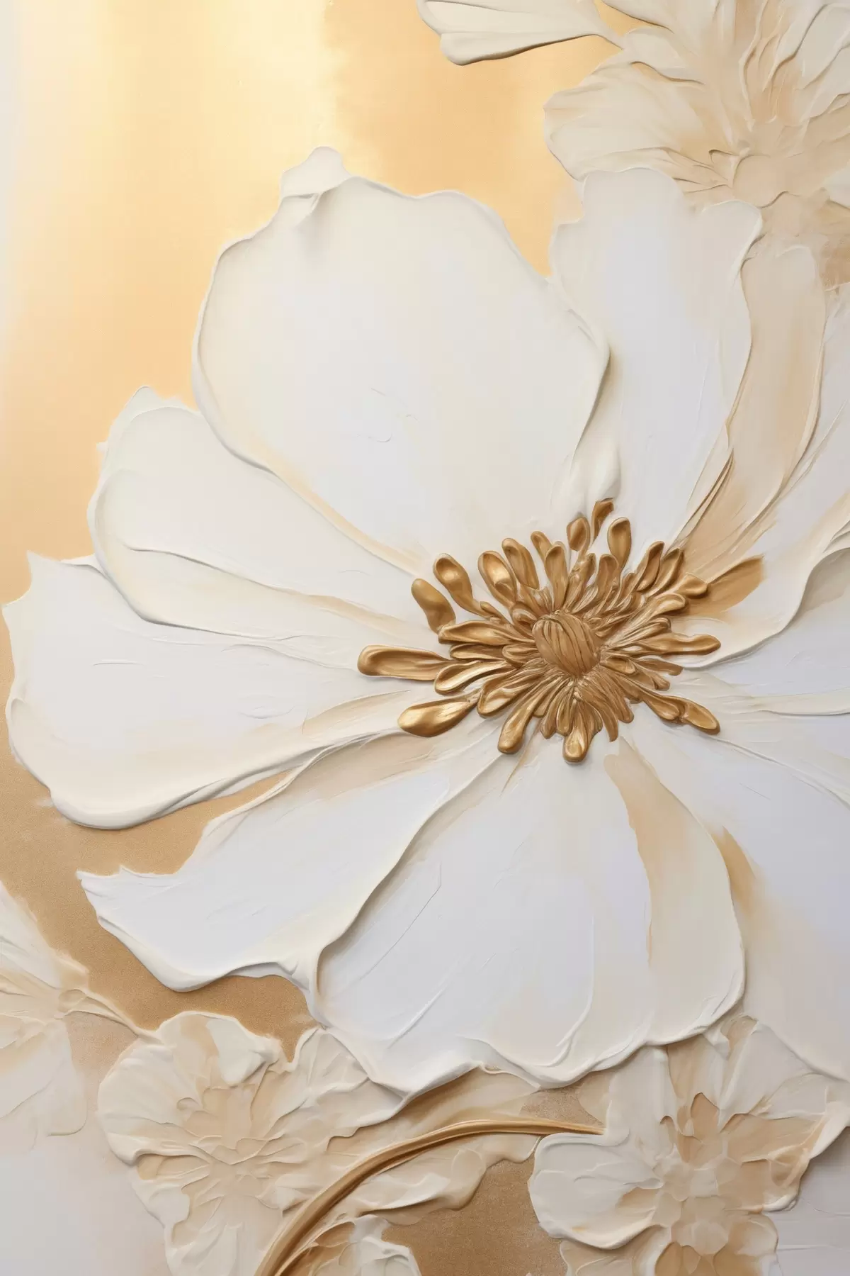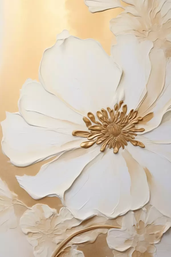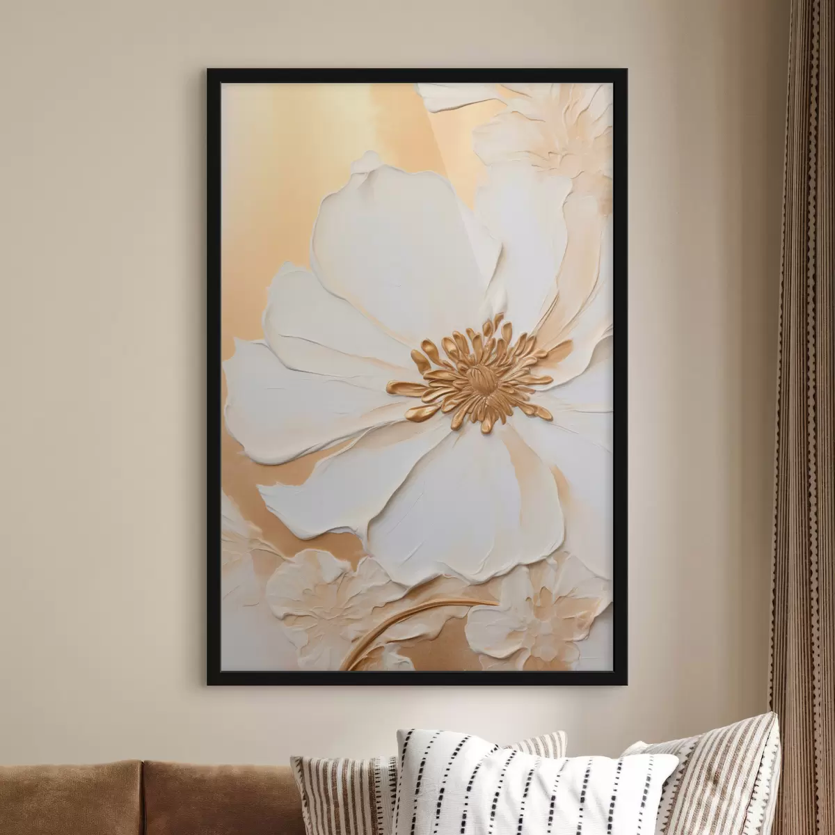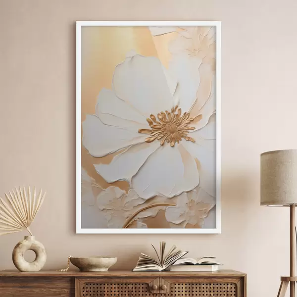 Poster Weiße Blume mit zarten Blütenblättern, imitiert durch dicke Pinselstriche, auf einem hellorangen, strukturierten Hintergrund. f46691