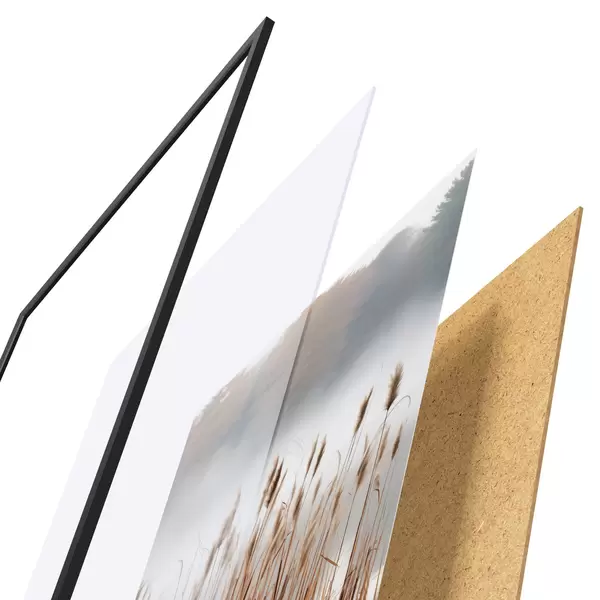 Das Poster besteht aus einem Rahmen, Plexiglas, einem gedruckten Bild und einer Rückwand aus Spanplatten. Dank der Halterungen auf der Rückseite kann das Poster sofort an die Wand gehängt werden.