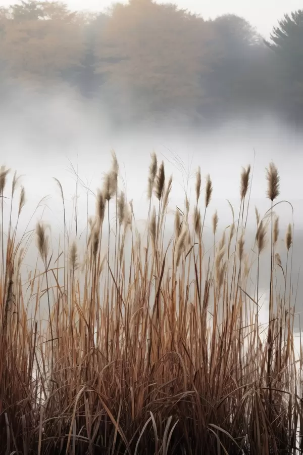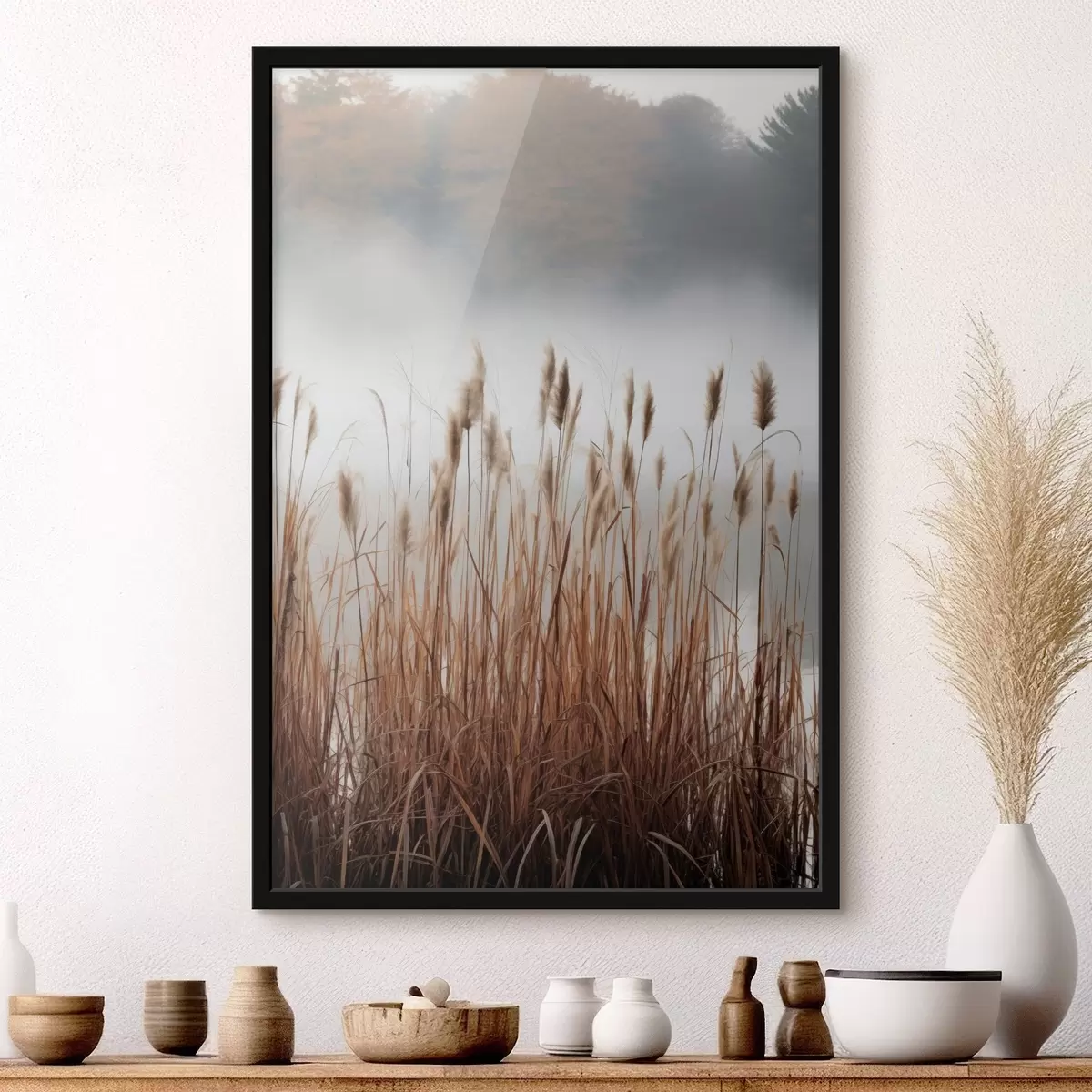 Poster Hohe Schilfpflanzen wachsen in einem Gewässer, das Wasser spiegelt die Schilfpflanzen wider, nebliger Hintergrund, sanftes Licht, Naturszene f46696