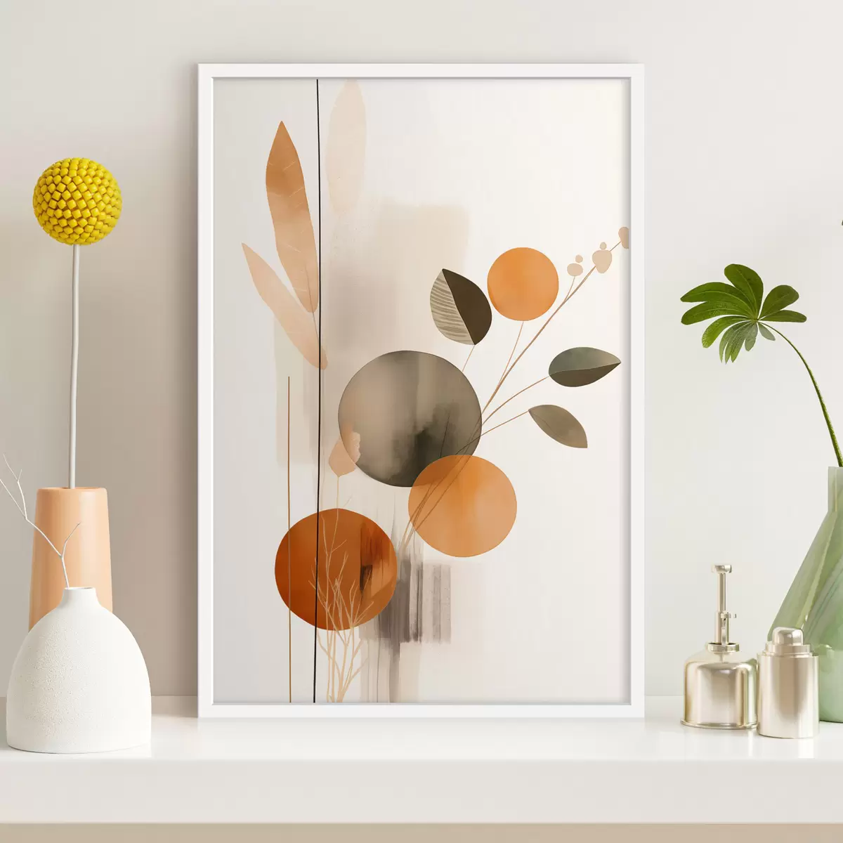 Poster Abstrakte Malerei-Imitation mit orangefarbenen und grauen Kreisen, Blättern und Zweigen, moderner Stil, Aquarelleffekt f46697