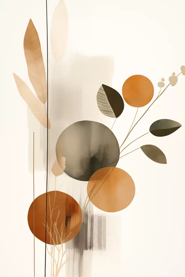 Poster Abstrakte Malerei-Imitation mit orangefarbenen und grauen Kreisen, Blättern und Zweigen, moderner Stil, Aquarelleffekt f46697