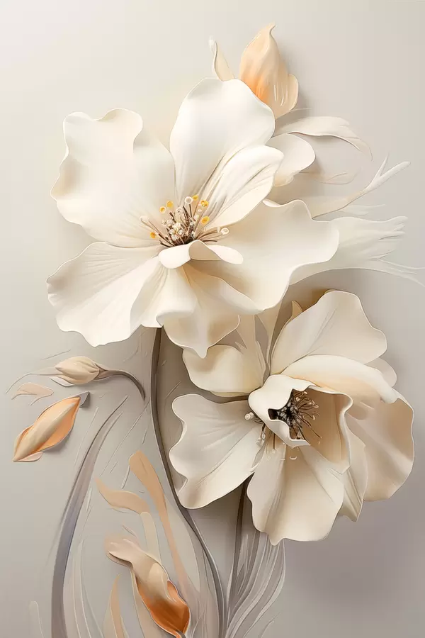 Poster Weiße Blumen, Blütenblätter mit sanften Schatten, hellbeiger Hintergrund, elegante Komposition, minimalistischer Stil Nr f46700