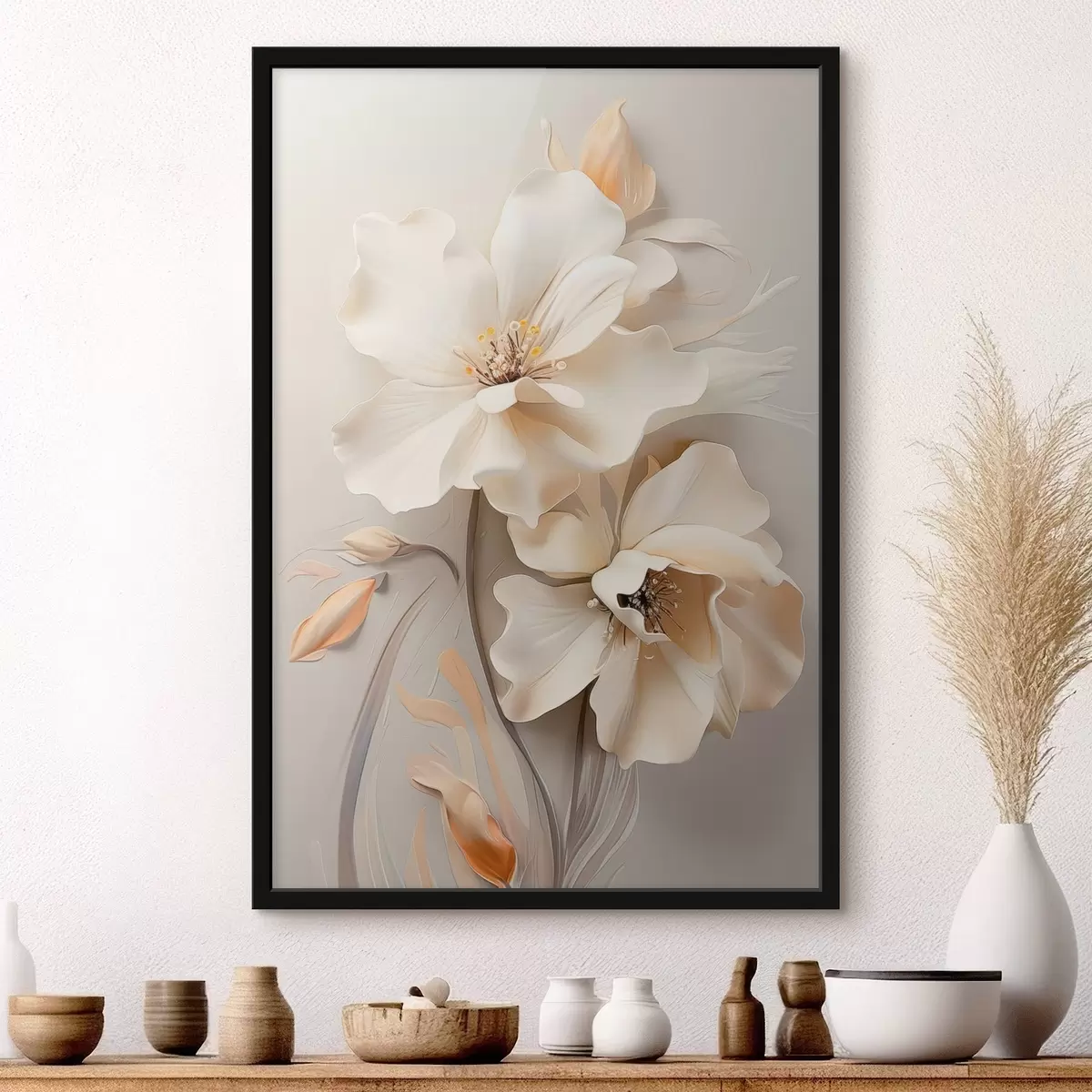 Poster Weiße Blumen, Blütenblätter mit sanften Schatten, hellbeiger Hintergrund, elegante Komposition, minimalistischer Stil f46700