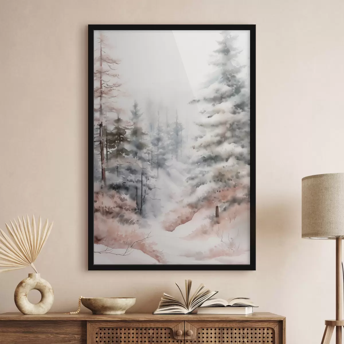 Poster Hohe, schneebedeckte Kiefern stehen in einem nebligen Wald, eine sanfte, gedämpfte Winterszene. Nr f46702
