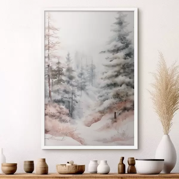 Poster Hohe, schneebedeckte Kiefern stehen in einem nebligen Wald, eine sanfte, gedämpfte Winterszene. f46702