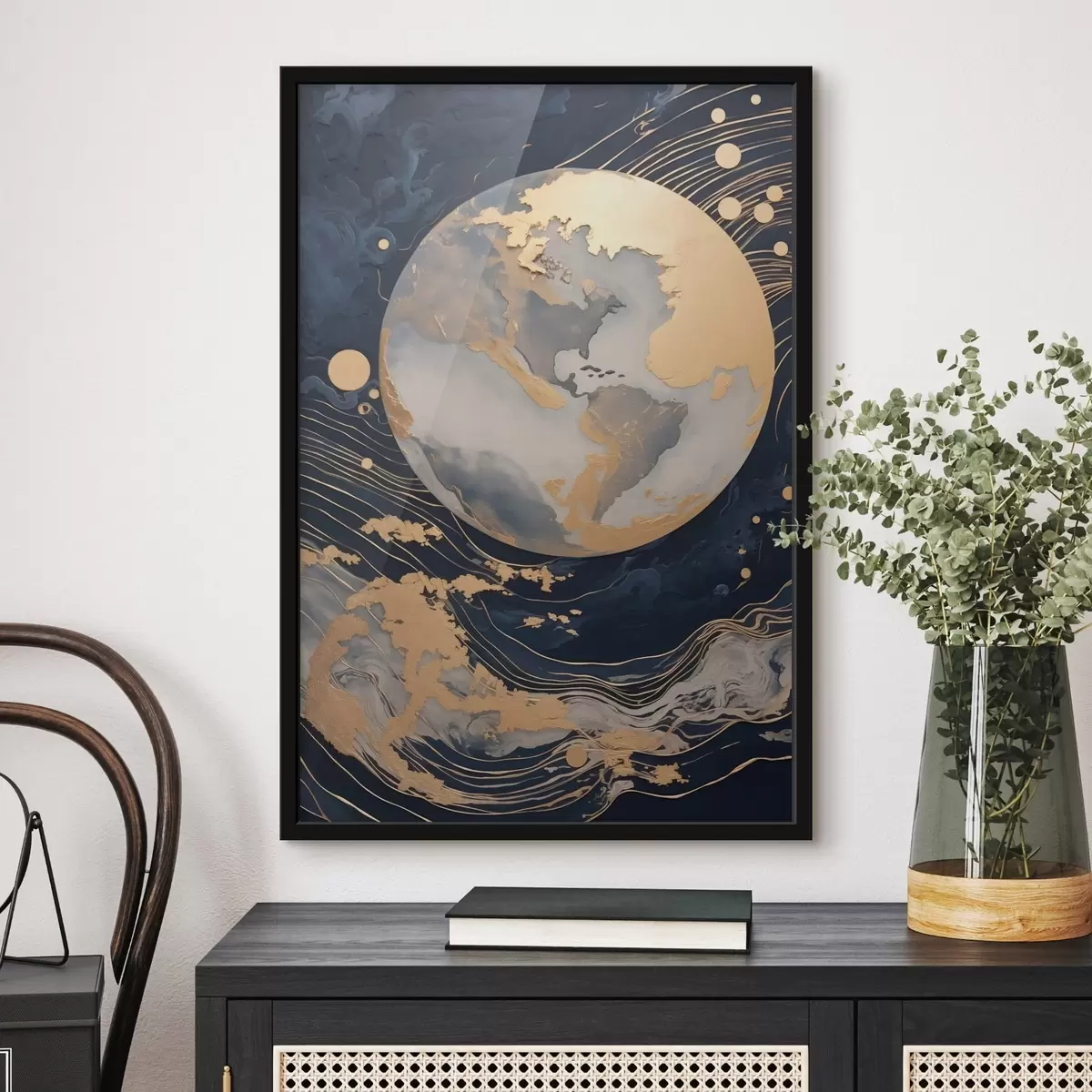 Poster Strukturierter dekorativer Planet mit gelben Linien im Hintergrund, gelben Punkten im Hintergrund, dunklem Hintergrund Nr f46708