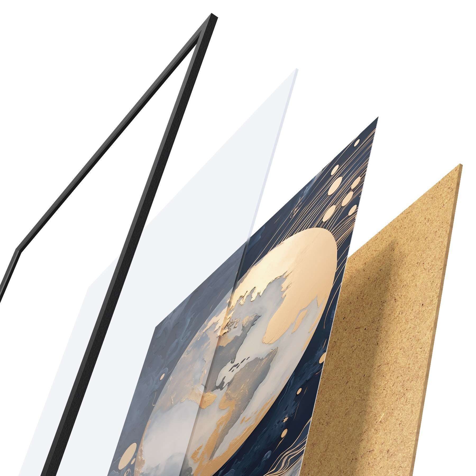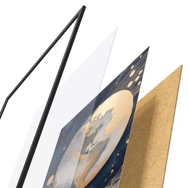 Das Poster besteht aus einem Rahmen, Plexiglas, einem gedruckten Bild und einer Rückwand aus Spanplatten. Dank der Halterungen auf der Rückseite kann das Poster sofort an die Wand gehängt werden.