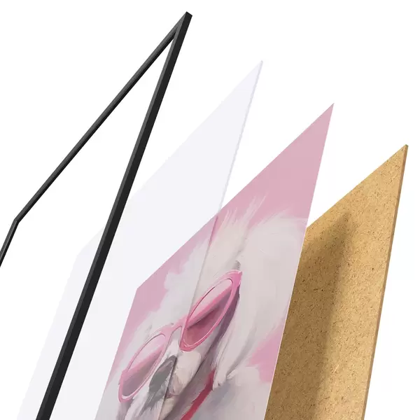 Das Poster besteht aus einem Rahmen, Plexiglas, einem gedruckten Bild und einer Rückwand aus Spanplatten. Dank der Halterungen auf der Rückseite kann das Poster sofort an die Wand gehängt werden.