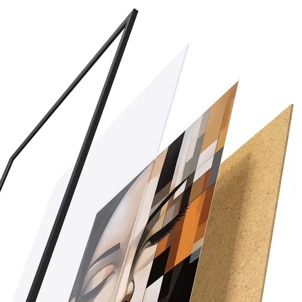 Das Poster besteht aus einem Rahmen, Plexiglas, einem gedruckten Bild und einer Rückwand aus Spanplatten. Dank der Halterungen auf der Rückseite kann das Poster sofort an die Wand gehängt werden.