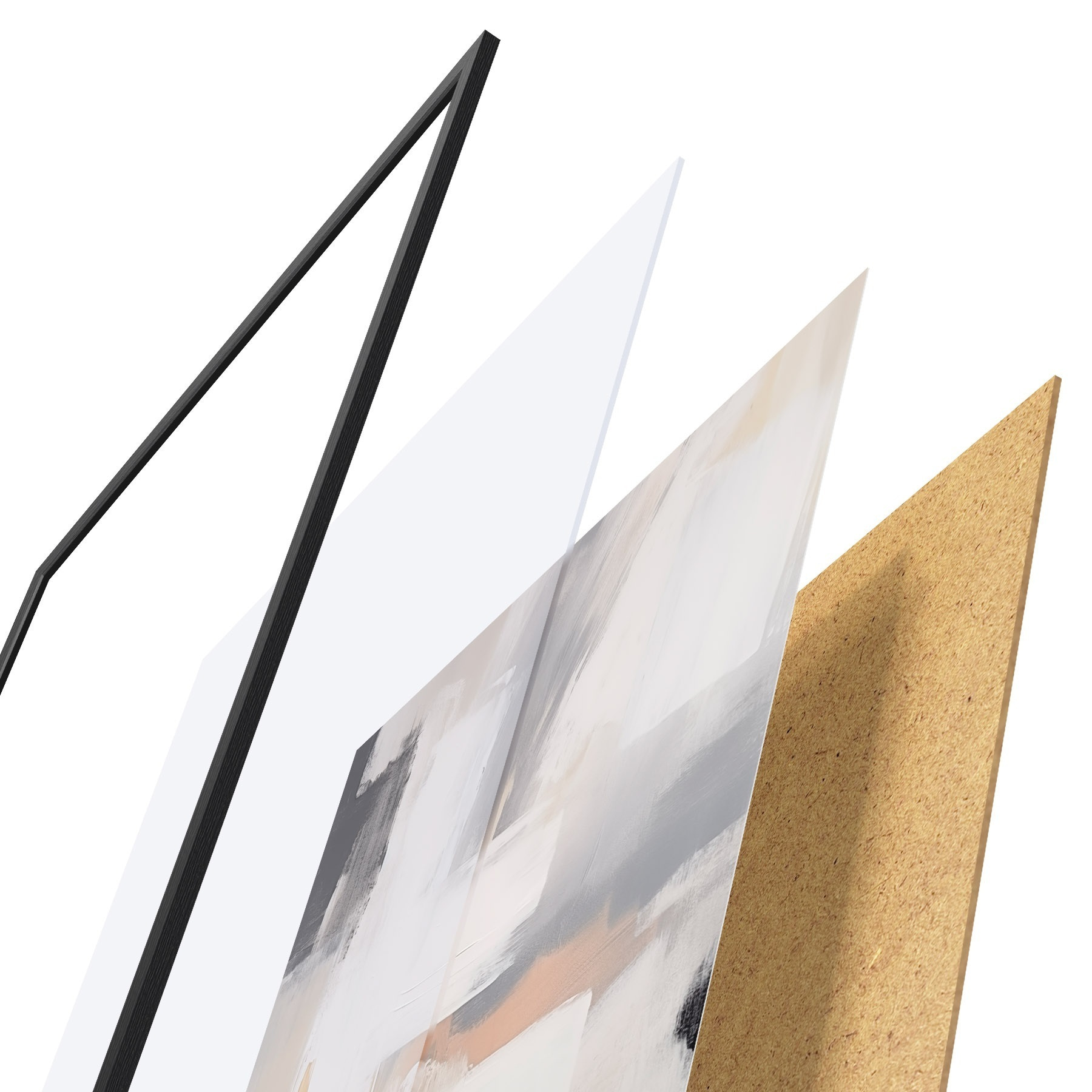 Das Poster besteht aus einem Rahmen, Plexiglas, einem gedruckten Bild und einer Rückwand aus Spanplatten. Dank der Halterungen auf der Rückseite kann das Poster sofort an die Wand gehängt werden.