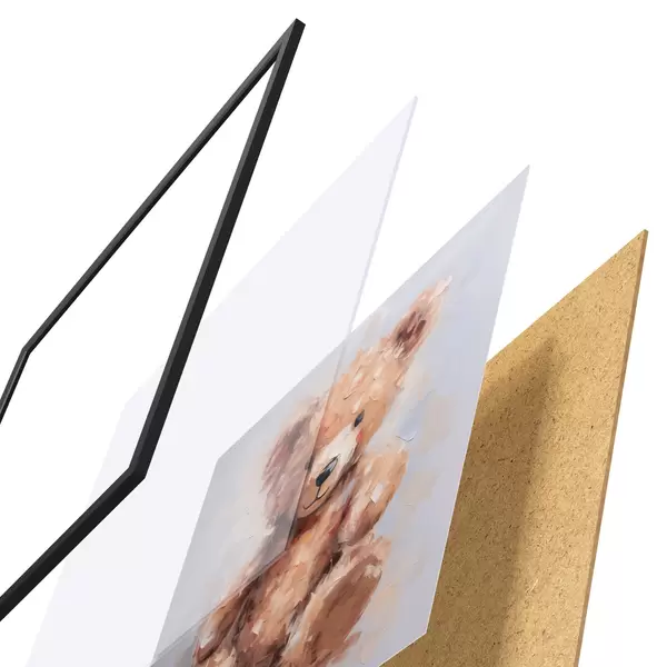 Das Poster besteht aus einem Rahmen, Plexiglas, einem gedruckten Bild und einer Rückwand aus Spanplatten. Dank der Halterungen auf der Rückseite kann das Poster sofort an die Wand gehängt werden.