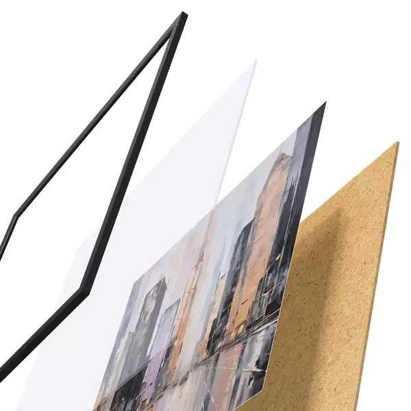 Das Poster besteht aus einem Rahmen, Plexiglas, einem gedruckten Bild und einer Rückwand aus Spanplatten. Dank der Halterungen auf der Rückseite kann das Poster sofort an die Wand gehängt werden.
