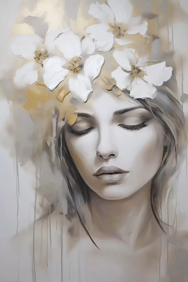Poster Abstraktes Porträt eines Mädchens mit Blumen, Nachahmung eines Gemäldes f46756