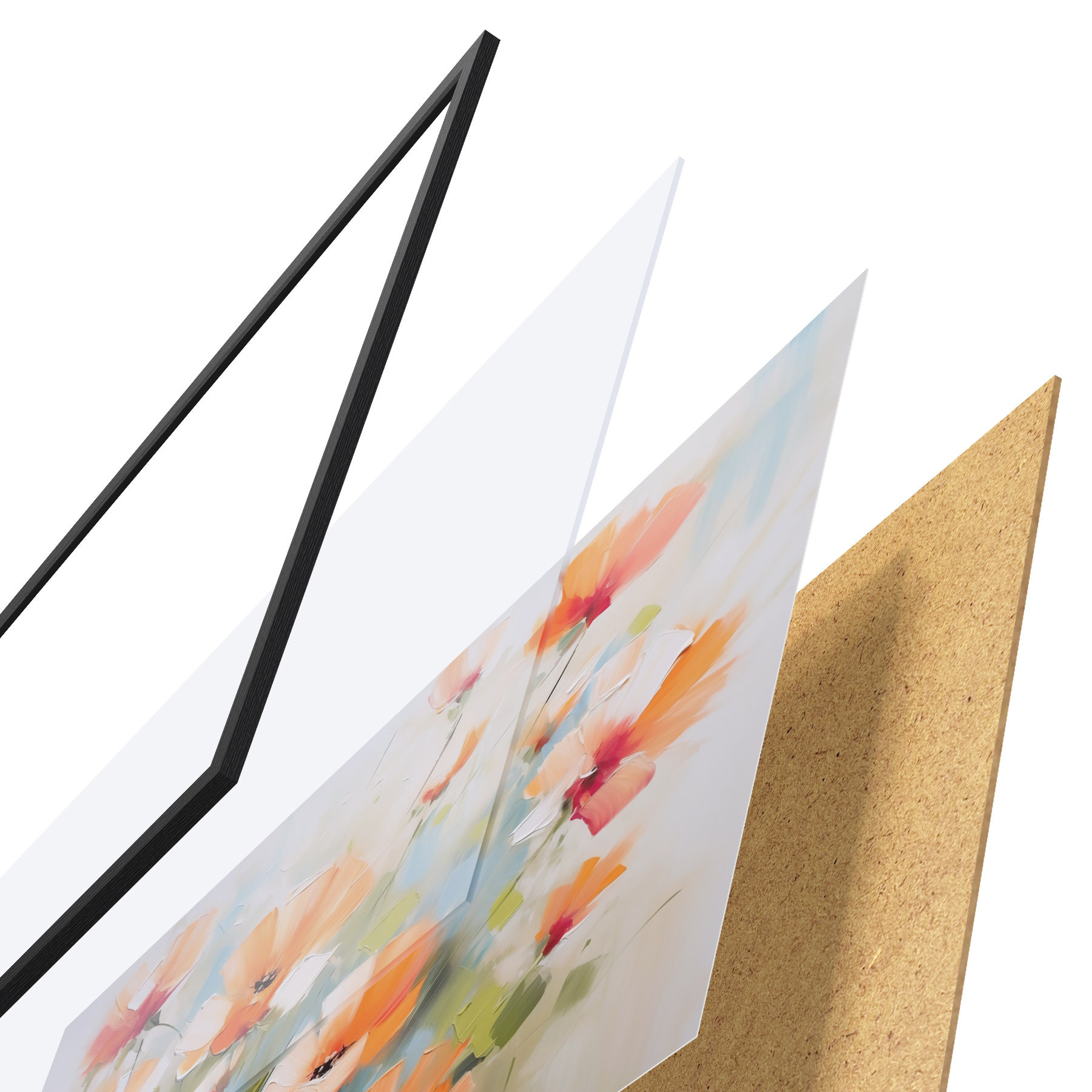 Das Poster besteht aus einem Rahmen, Plexiglas, einem gedruckten Bild und einer Rückwand aus Spanplatten. Dank der Halterungen auf der Rückseite kann das Poster sofort an die Wand gehängt werden.