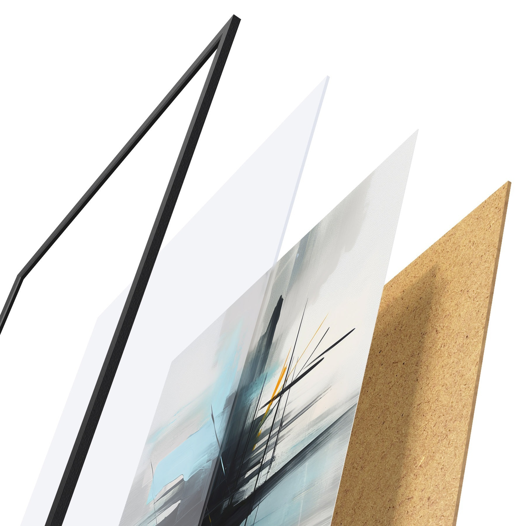 Das Poster besteht aus einem Rahmen, Plexiglas, einem gedruckten Bild und einer Rückwand aus Spanplatten. Dank der Halterungen auf der Rückseite kann das Poster sofort an die Wand gehängt werden.