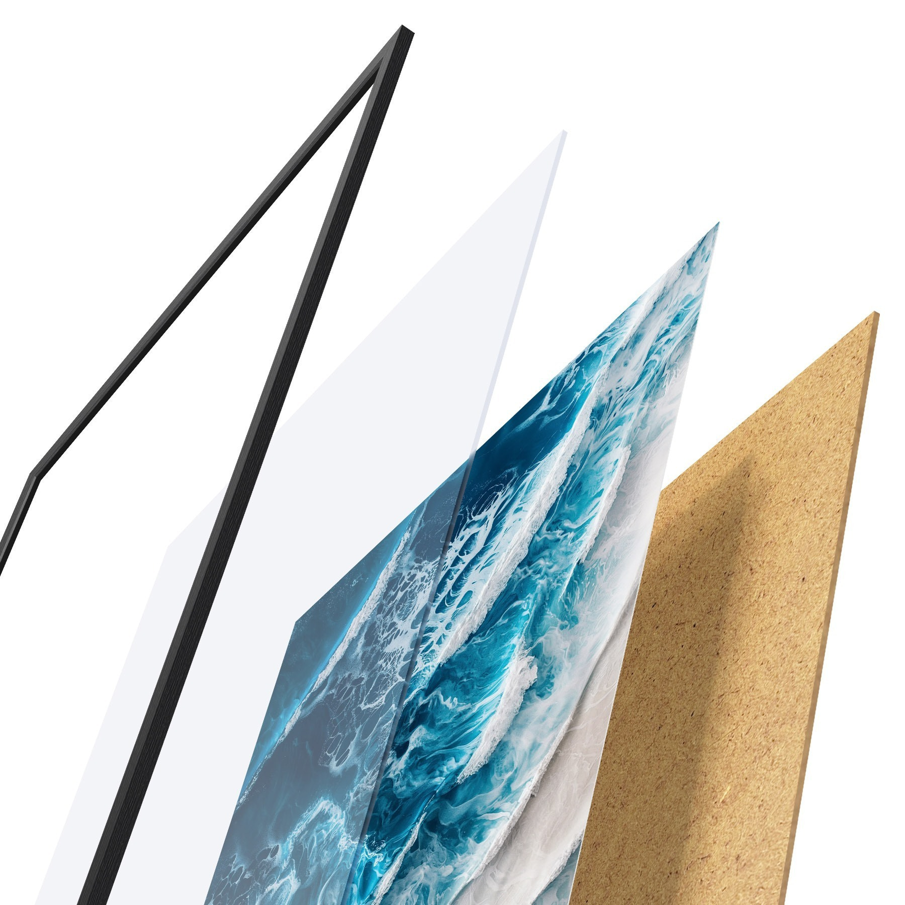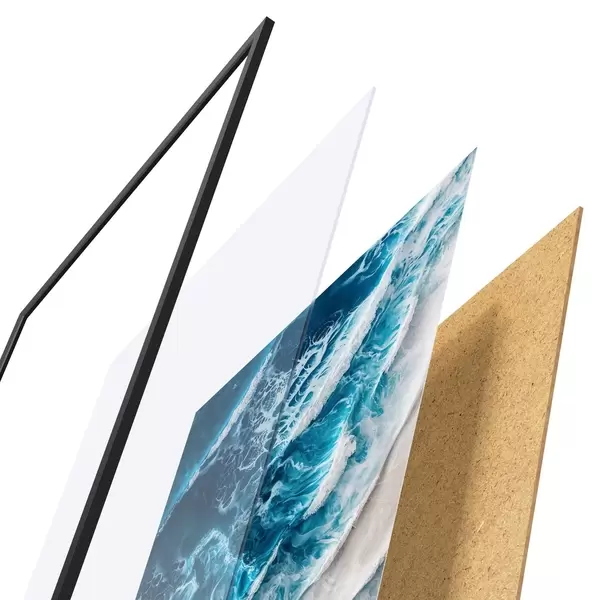 Das Poster besteht aus einem Rahmen, Plexiglas, einem gedruckten Bild und einer Rückwand aus Spanplatten. Dank der Halterungen auf der Rückseite kann das Poster sofort an die Wand gehängt werden.