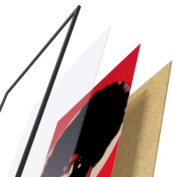 Das Poster besteht aus einem Rahmen, Plexiglas, einem gedruckten Bild und einer Rückwand aus Spanplatten. Dank der Halterungen auf der Rückseite kann das Poster sofort an die Wand gehängt werden.