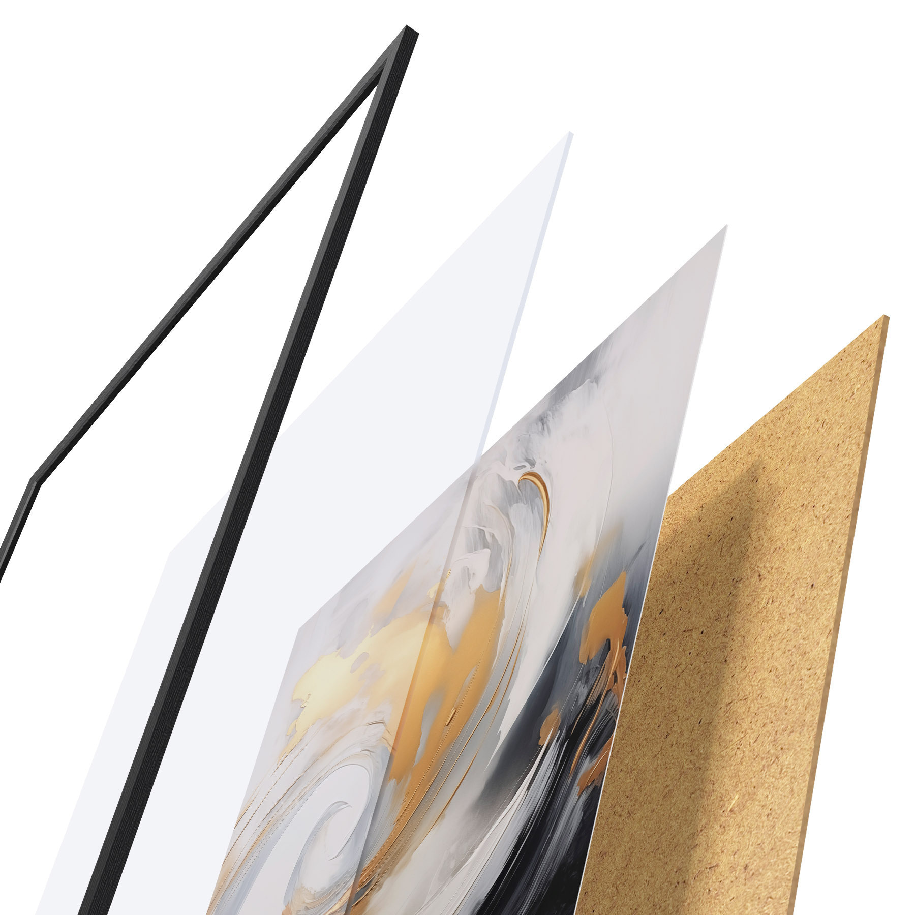Das Poster besteht aus einem Rahmen, Plexiglas, einem gedruckten Bild und einer Rückwand aus Spanplatten. Dank der Halterungen auf der Rückseite kann das Poster sofort an die Wand gehängt werden.