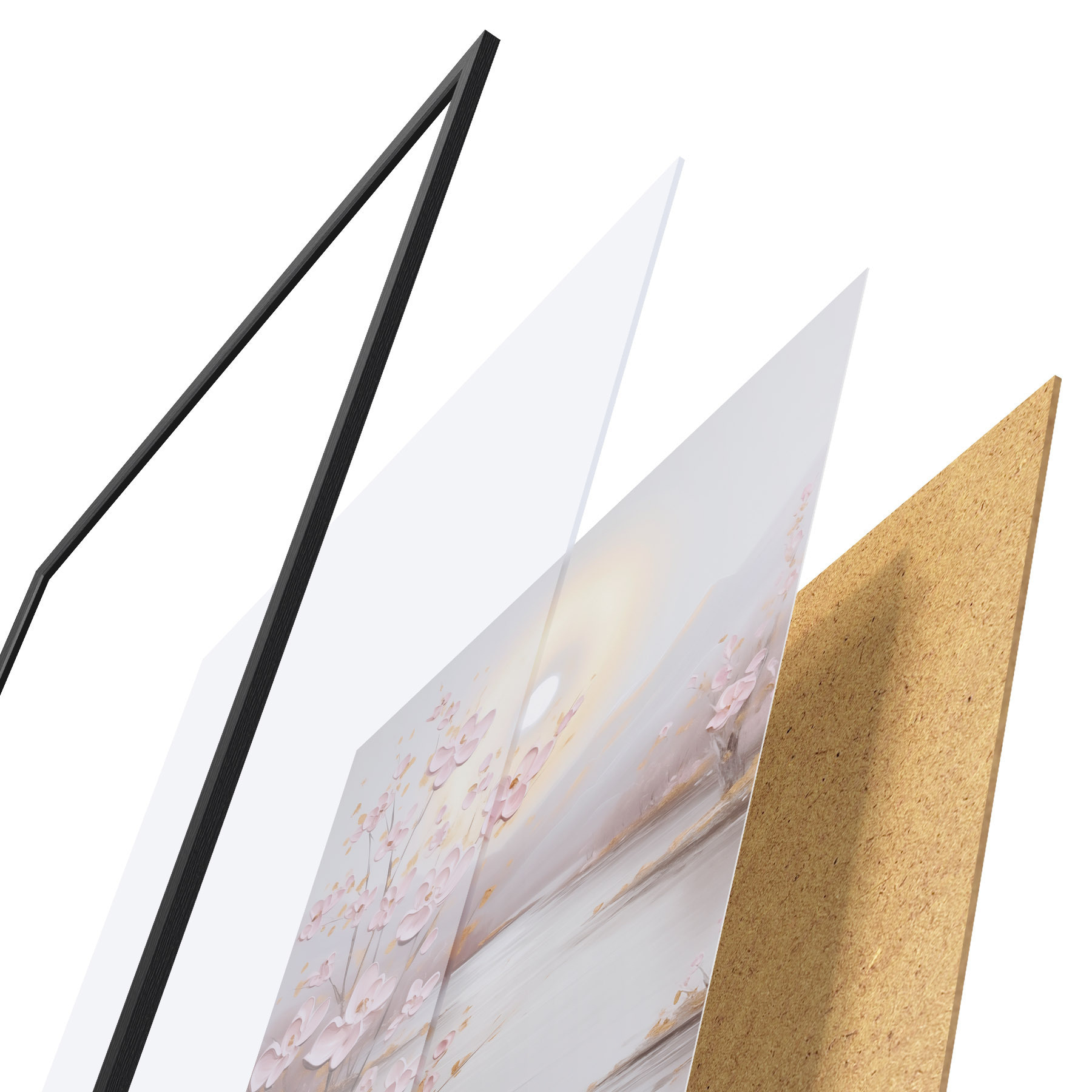 Das Poster besteht aus einem Rahmen, Plexiglas, einem gedruckten Bild und einer Rückwand aus Spanplatten. Dank der Halterungen auf der Rückseite kann das Poster sofort an die Wand gehängt werden.