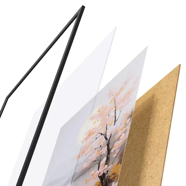 Das Poster besteht aus einem Rahmen, Plexiglas, einem gedruckten Bild und einer Rückwand aus Spanplatten. Dank der Halterungen auf der Rückseite kann das Poster sofort an die Wand gehängt werden.