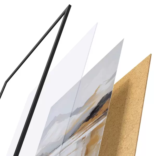 Das Poster besteht aus einem Rahmen, Plexiglas, einem gedruckten Bild und einer Rückwand aus Spanplatten. Dank der Halterungen auf der Rückseite kann das Poster sofort an die Wand gehängt werden.