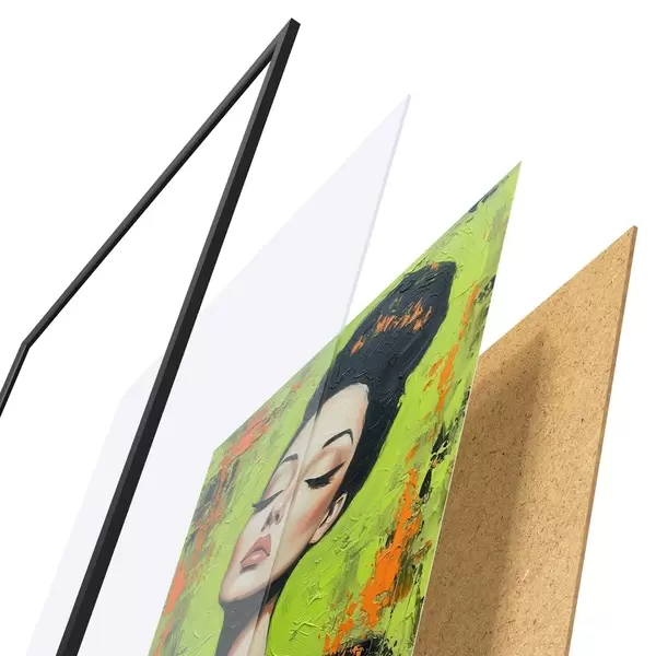 Das Poster besteht aus einem Rahmen, Plexiglas, einem gedruckten Bild und einer Rückwand aus Spanplatten. Dank der Halterungen auf der Rückseite kann das Poster sofort an die Wand gehängt werden.