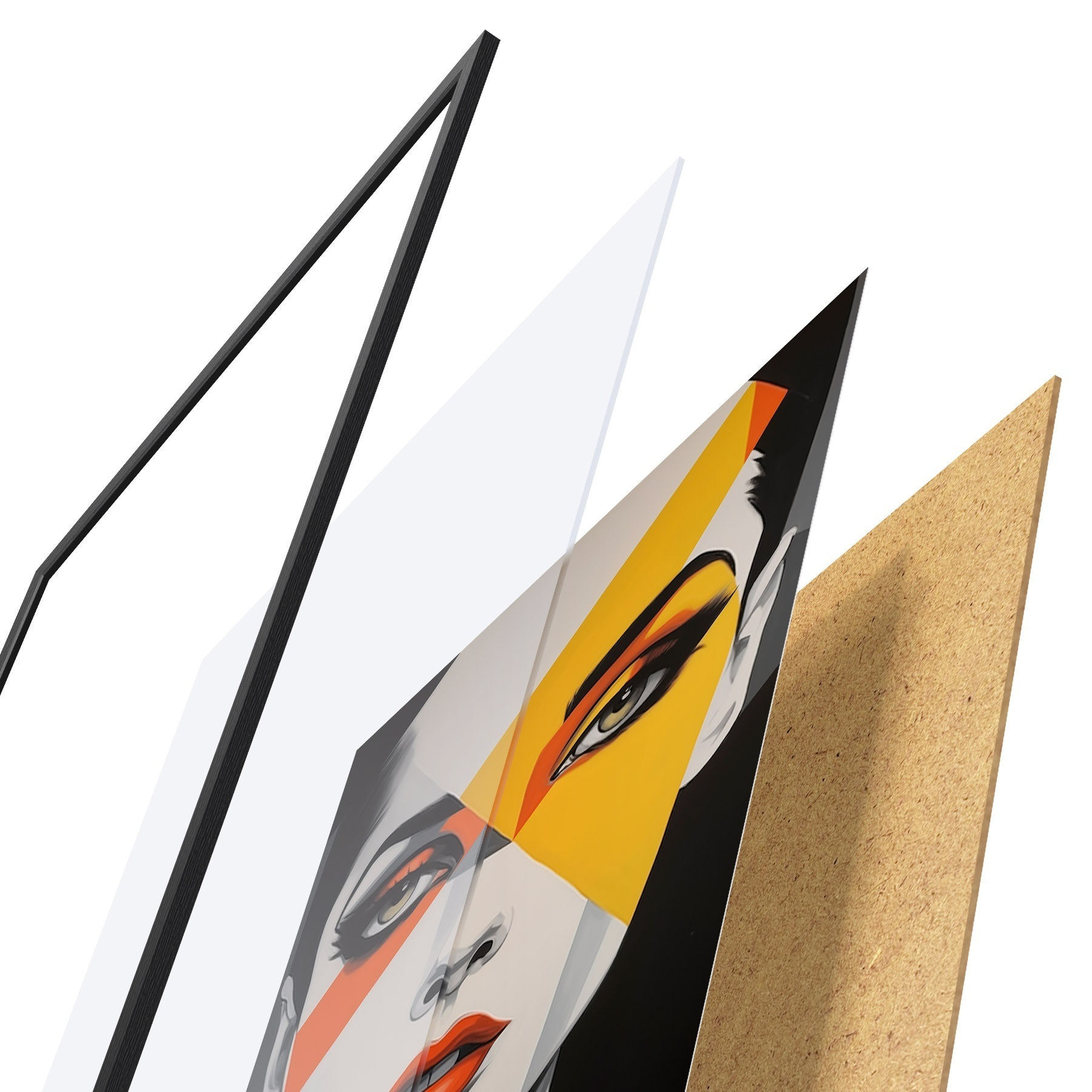 Das Poster besteht aus einem Rahmen, Plexiglas, einem gedruckten Bild und einer Rückwand aus Spanplatten. Dank der Halterungen auf der Rückseite kann das Poster sofort an die Wand gehängt werden.