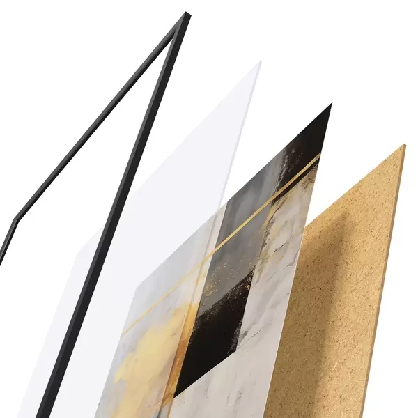 Das Poster besteht aus einem Rahmen, Plexiglas, einem gedruckten Bild und einer Rückwand aus Spanplatten. Dank der Halterungen auf der Rückseite kann das Poster sofort an die Wand gehängt werden.