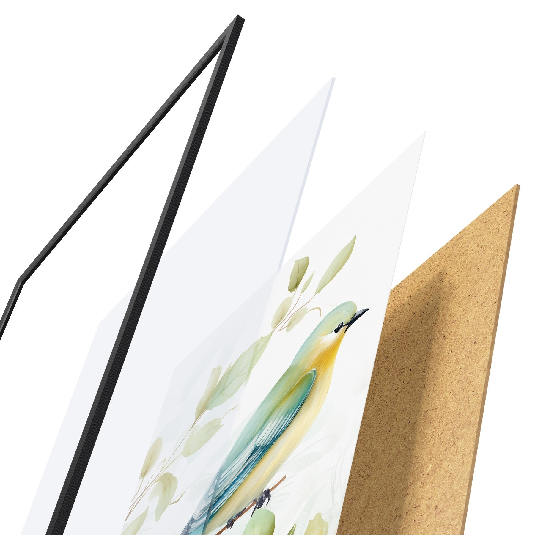 Das Poster besteht aus einem Rahmen, Plexiglas, einem gedruckten Bild und einer Rückwand aus Spanplatten. Dank der Halterungen auf der Rückseite kann das Poster sofort an die Wand gehängt werden.