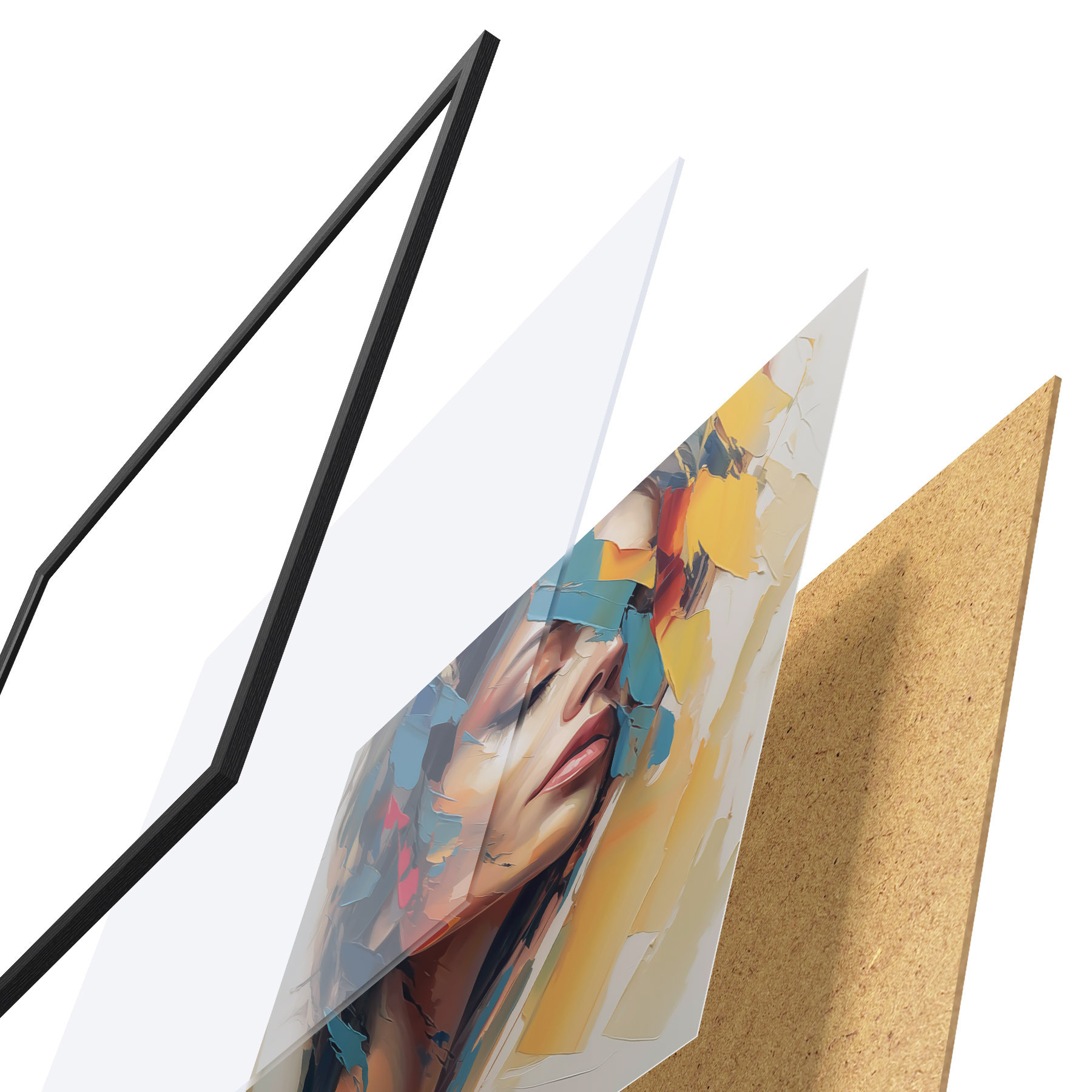 Das Poster besteht aus einem Rahmen, Plexiglas, einem gedruckten Bild und einer Rückwand aus Spanplatten. Dank der Halterungen auf der Rückseite kann das Poster sofort an die Wand gehängt werden.