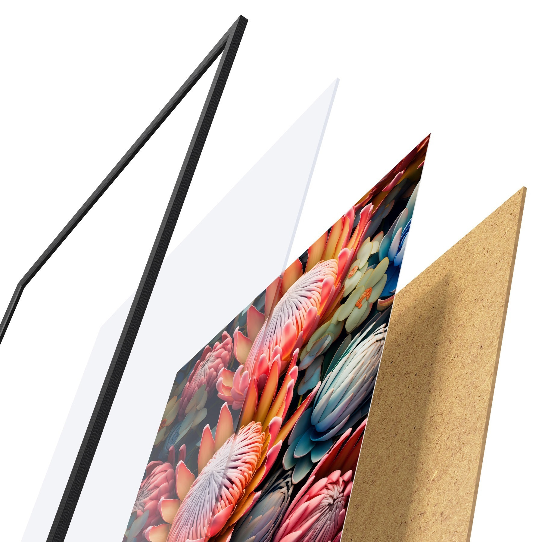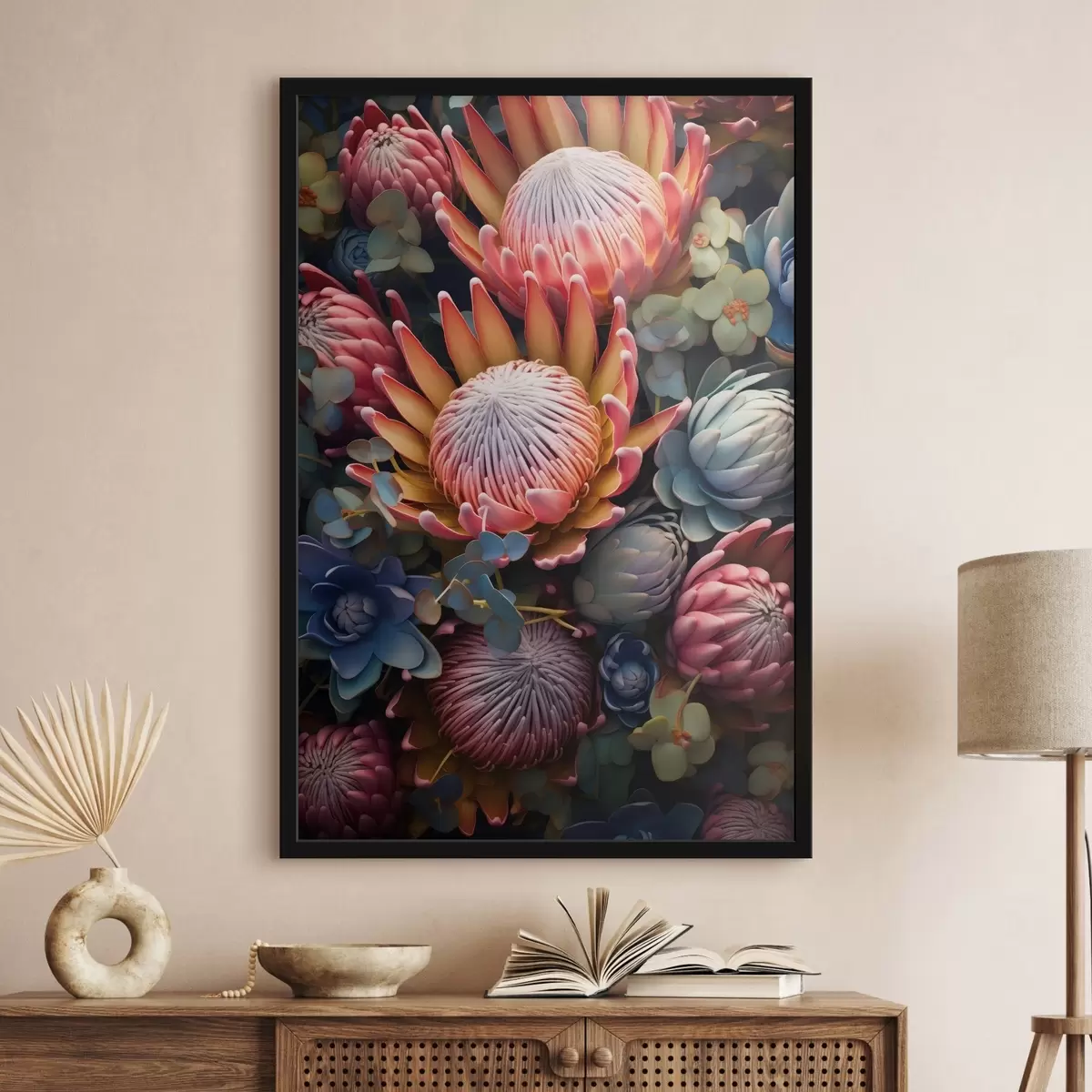 Poster Komposition aus Proteas, Eukalyptus und Sukkulenten in einem fotorealistischen digitalen Kunststil f46925