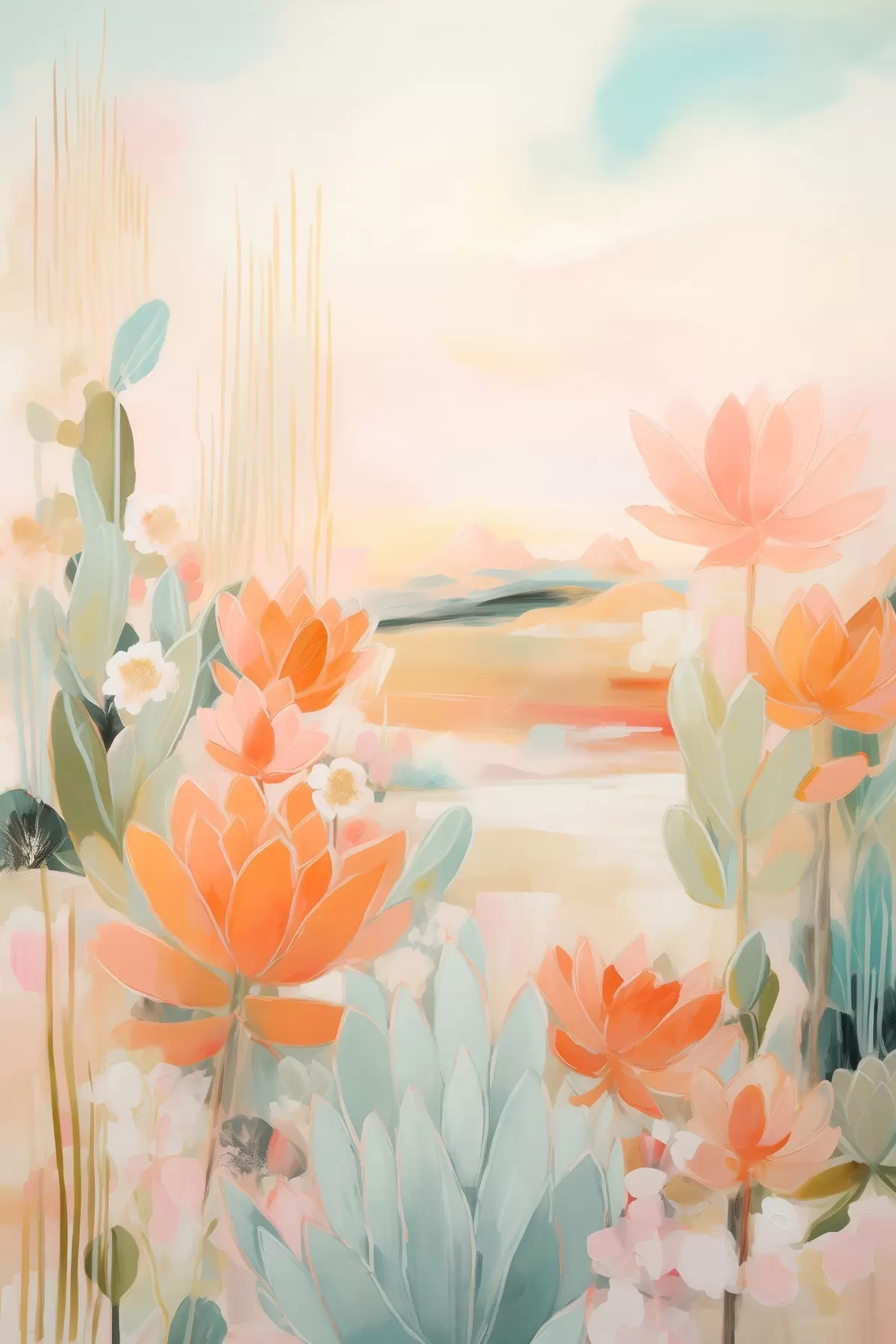 Poster Blumenlandschaft in Rosa- und Blautönen in einem zeitgenössischen Malstil Nr f46931