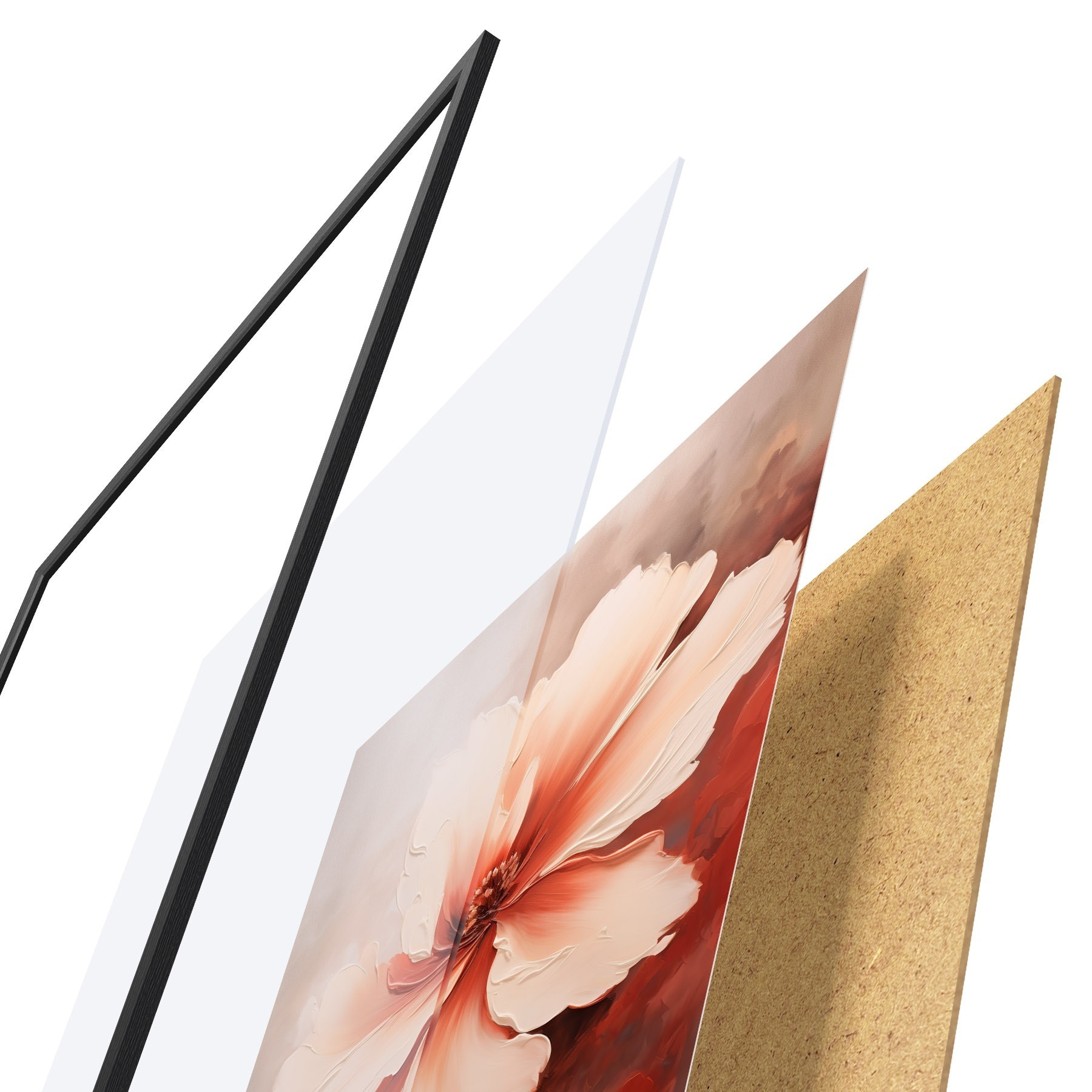Das Poster besteht aus einem Rahmen, Plexiglas, einem gedruckten Bild und einer Rückwand aus Spanplatten. Dank der Halterungen auf der Rückseite kann das Poster sofort an die Wand gehängt werden.