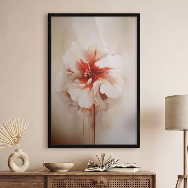 Poster Weiße und rote Blume mit halbtransparenten Blütenblättern und fließenden Farbtropfen f46940