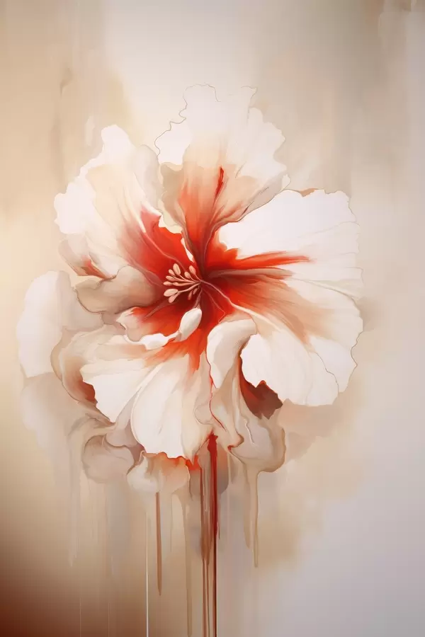 Poster Weiße und rote Blume mit halbtransparenten Blütenblättern und fließenden Farbtropfen Nr f46940