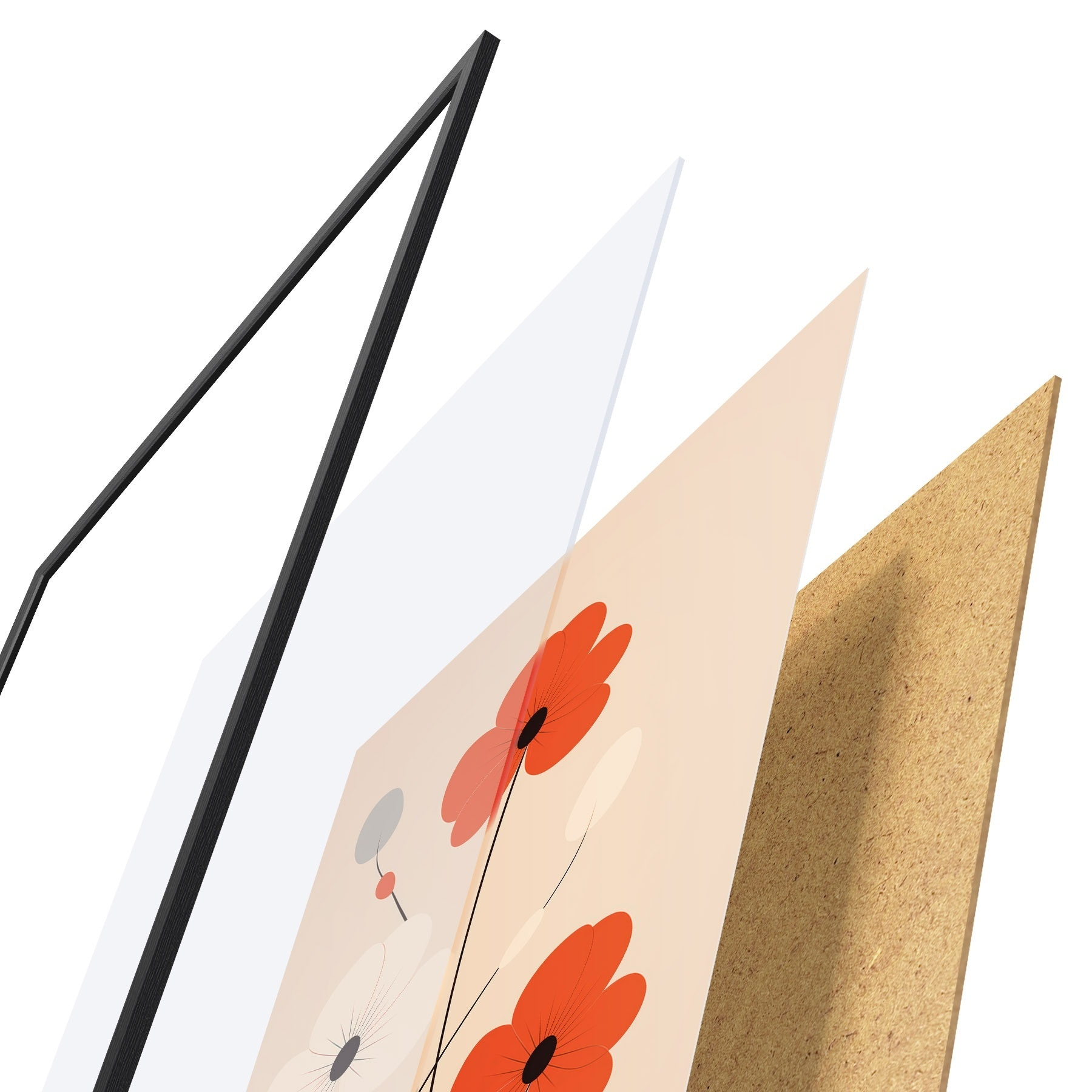 Das Poster besteht aus einem Rahmen, Plexiglas, einem gedruckten Bild und einer Rückwand aus Spanplatten. Dank der Halterungen auf der Rückseite kann das Poster sofort an die Wand gehängt werden.