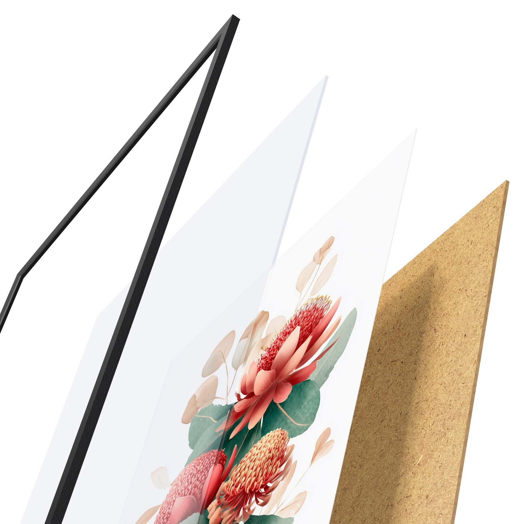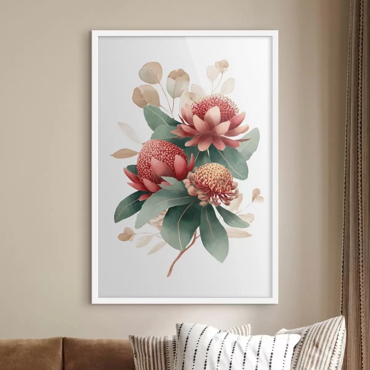 Poster Blumenkomposition mit großen Proteas und Eukalyptus im modernen Stil digitaler Malerei f46955