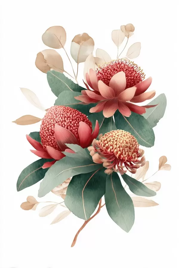 Poster Blumenkomposition mit großen Proteas und Eukalyptus im modernen Stil digitaler Malerei Nr f46955