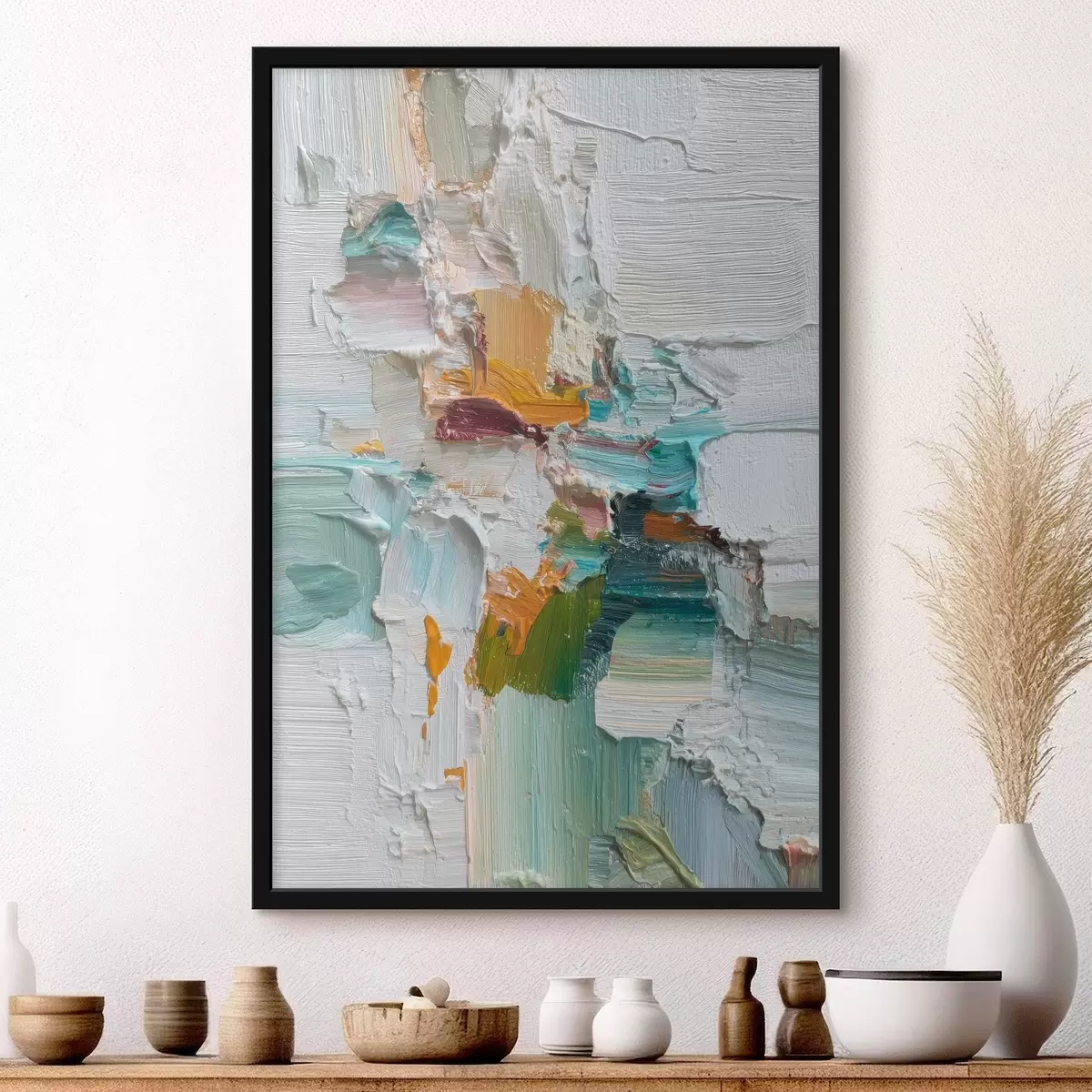 Poster Komposition mit türkisfarbenen und orangefarbenen Akzenten im Stil der Ölmalerei f46958