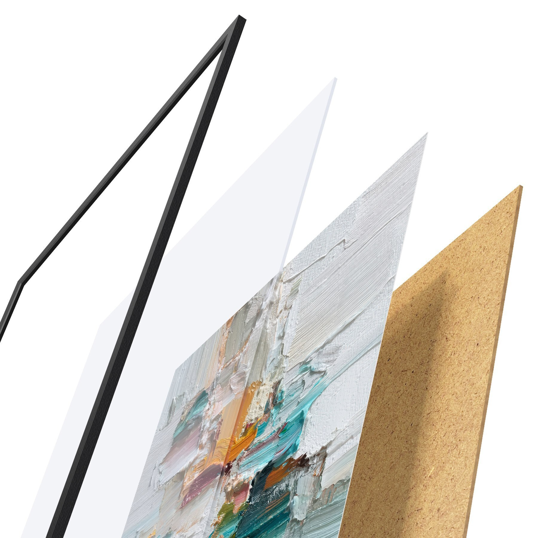 Das Poster besteht aus einem Rahmen, Plexiglas, einem gedruckten Bild und einer Rückwand aus Spanplatten. Dank der Halterungen auf der Rückseite kann das Poster sofort an die Wand gehängt werden.