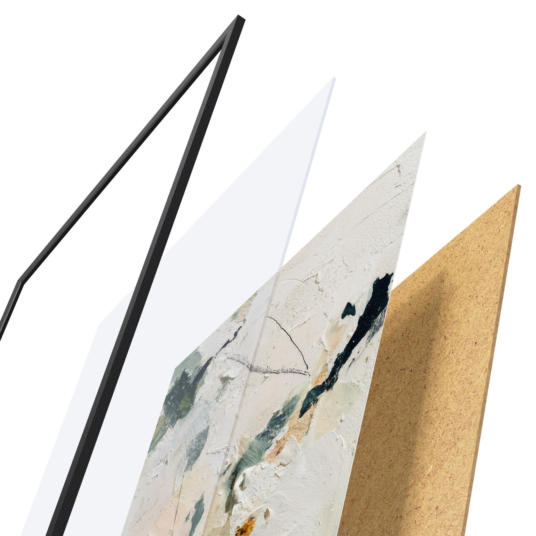 Das Poster besteht aus einem Rahmen, Plexiglas, einem gedruckten Bild und einer Rückwand aus Spanplatten. Dank der Halterungen auf der Rückseite kann das Poster sofort an die Wand gehängt werden.