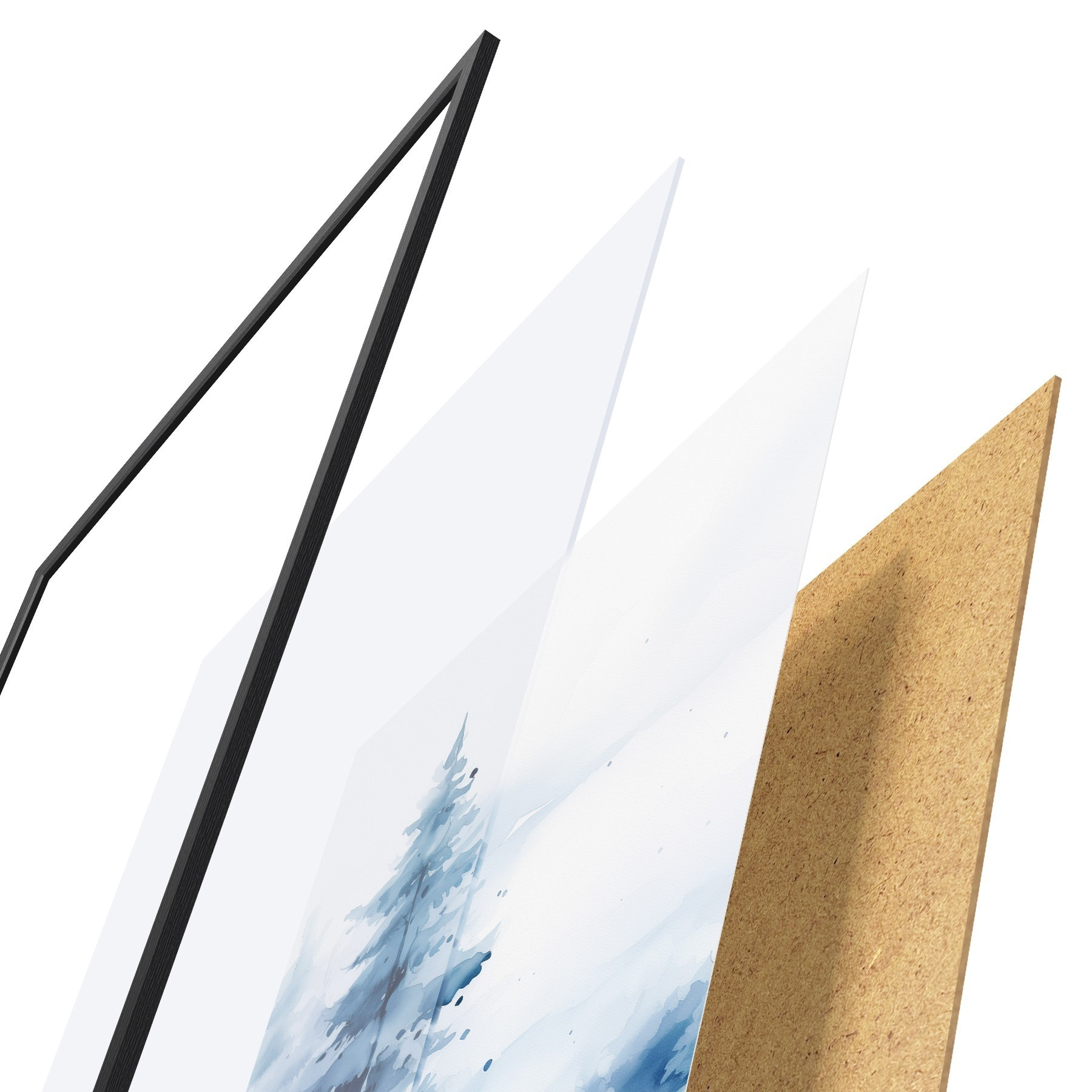 Das Poster besteht aus einem Rahmen, Plexiglas, einem gedruckten Bild und einer Rückwand aus Spanplatten. Dank der Halterungen auf der Rückseite kann das Poster sofort an die Wand gehängt werden.