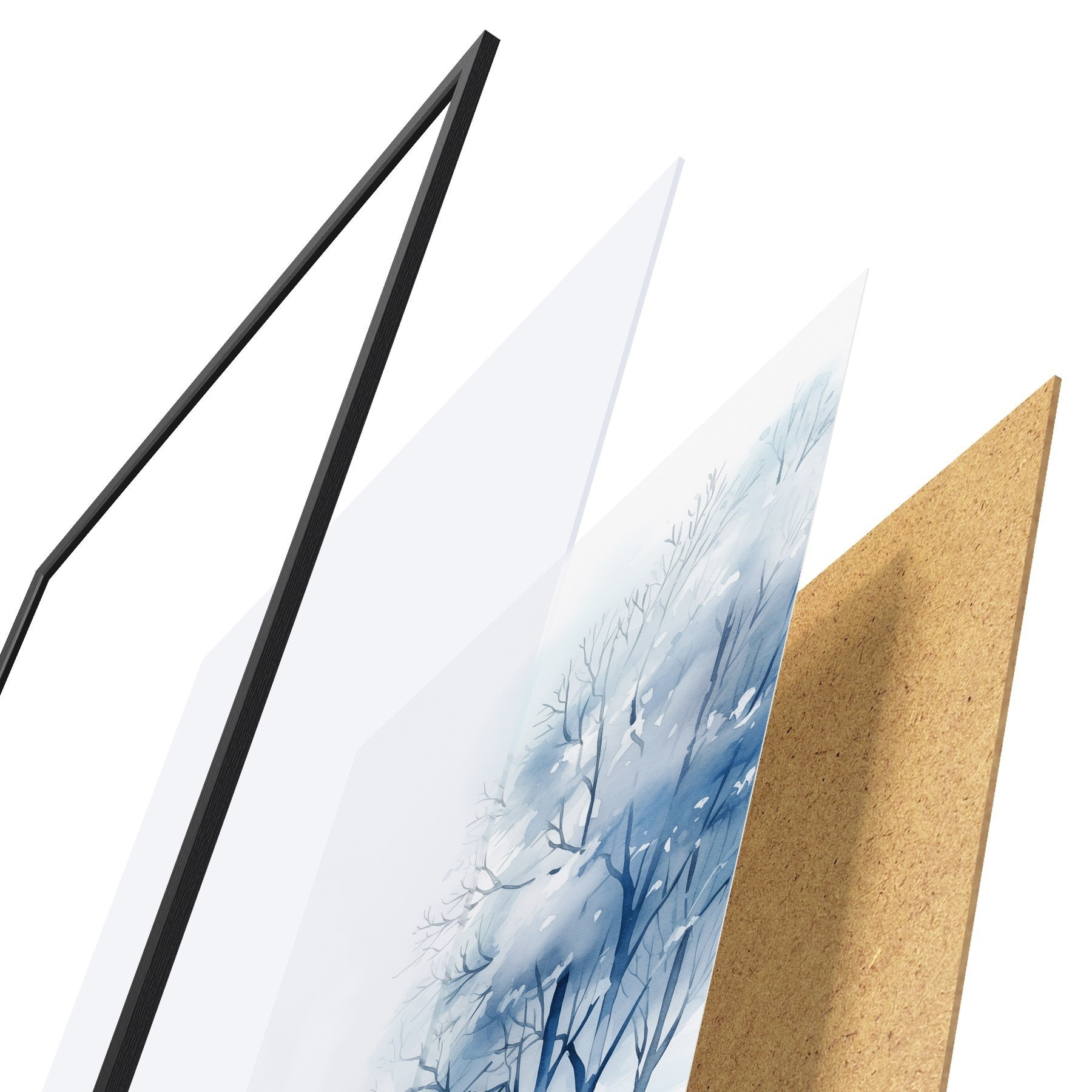 Das Poster besteht aus einem Rahmen, Plexiglas, einem gedruckten Bild und einer Rückwand aus Spanplatten. Dank der Halterungen auf der Rückseite kann das Poster sofort an die Wand gehängt werden.
