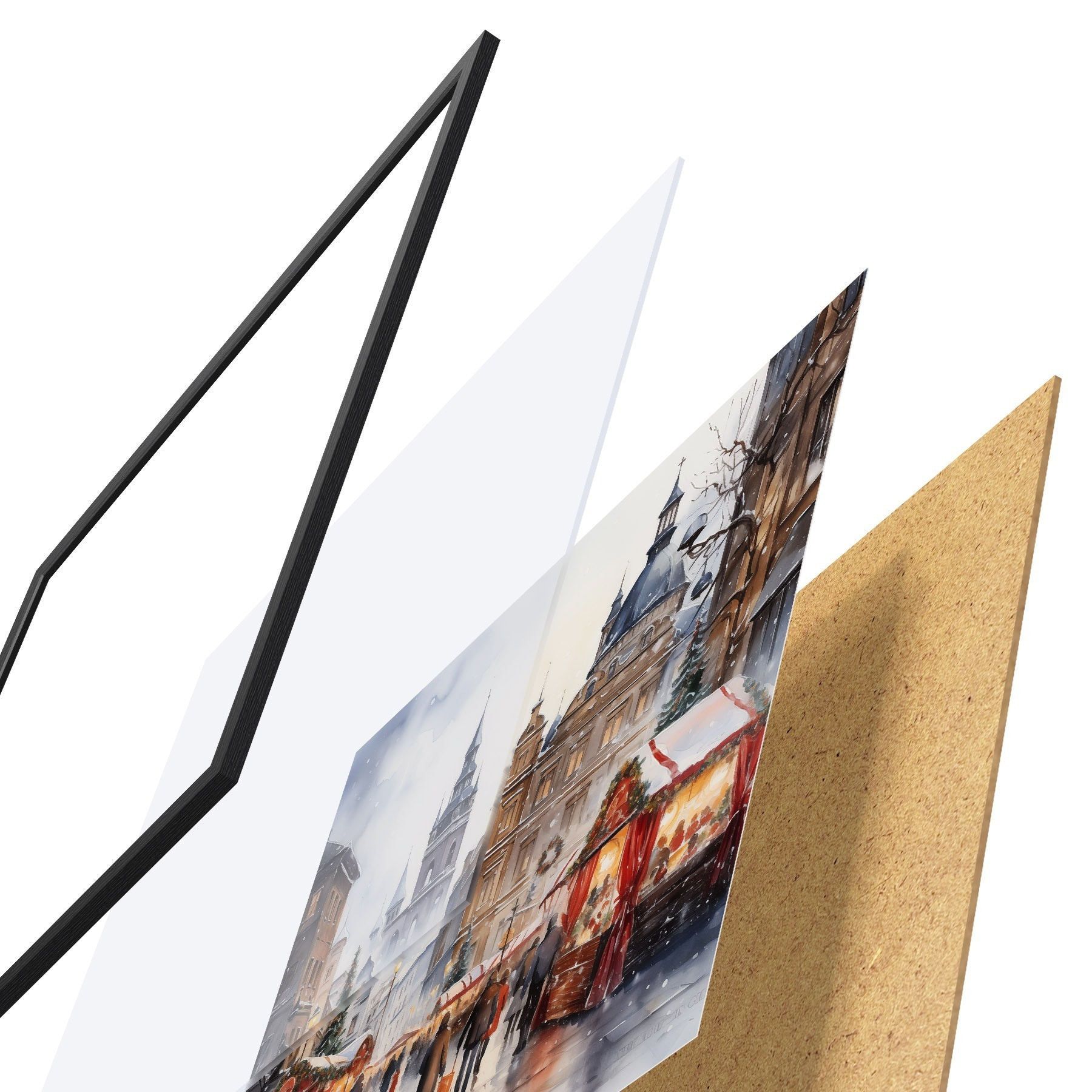 Das Poster besteht aus einem Rahmen, Plexiglas, einem gedruckten Bild und einer Rückwand aus Spanplatten. Dank der Halterungen auf der Rückseite kann das Poster sofort an die Wand gehängt werden.