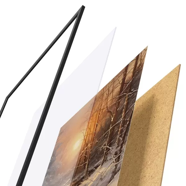 Das Poster besteht aus einem Rahmen, Plexiglas, einem gedruckten Bild und einer Rückwand aus Spanplatten. Dank der Halterungen auf der Rückseite kann das Poster sofort an die Wand gehängt werden.