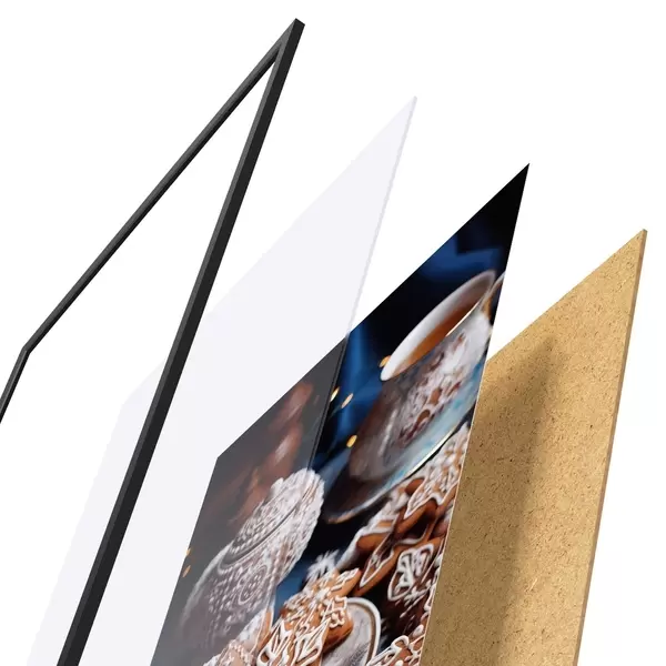 Das Poster besteht aus einem Rahmen, Plexiglas, einem gedruckten Bild und einer Rückwand aus Spanplatten. Dank der Halterungen auf der Rückseite kann das Poster sofort an die Wand gehängt werden.