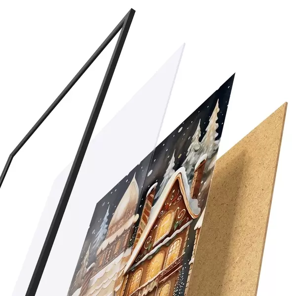 Das Poster besteht aus einem Rahmen, Plexiglas, einem gedruckten Bild und einer Rückwand aus Spanplatten. Dank der Halterungen auf der Rückseite kann das Poster sofort an die Wand gehängt werden.