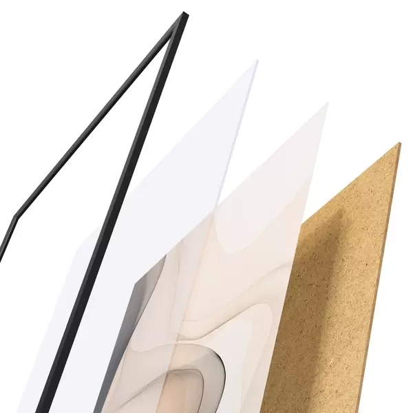 Das Poster besteht aus einem Rahmen, Plexiglas, einem gedruckten Bild und einer Rückwand aus Spanplatten. Dank der Halterungen auf der Rückseite kann das Poster sofort an die Wand gehängt werden.